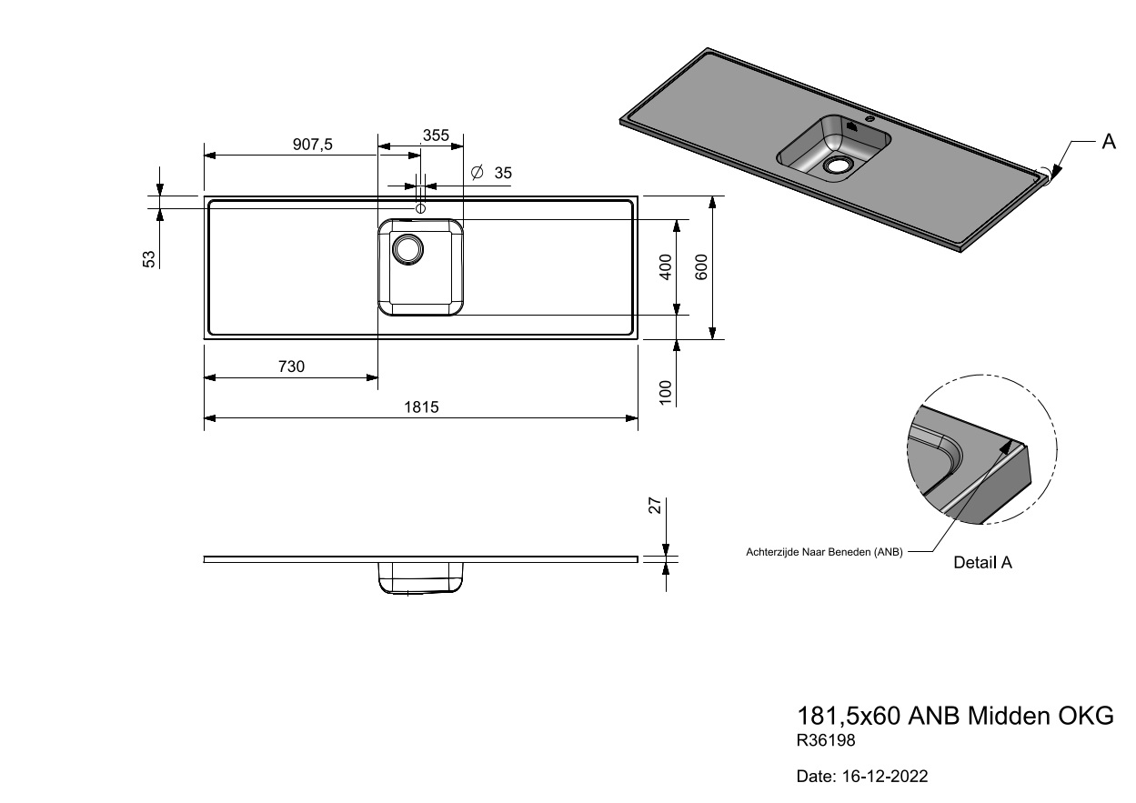 Diamond 1815x600mm, single sink middle