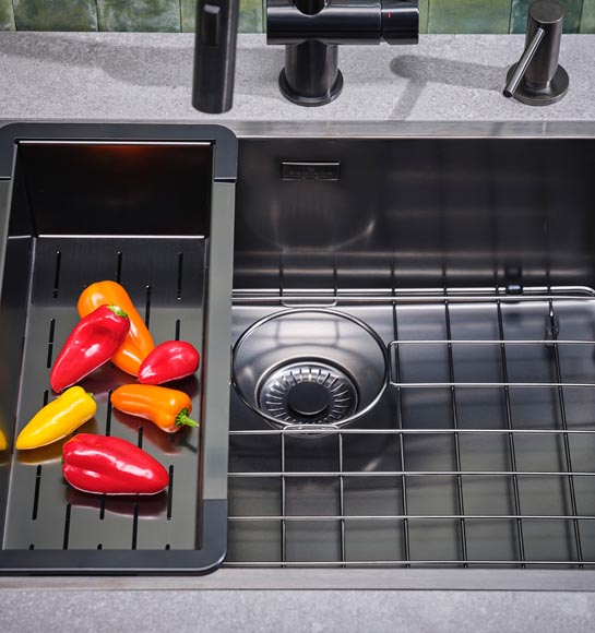 It is possible to expand the New York PVD sinks with matching accessories. We have matching colanders, overflows and comfort plugs.